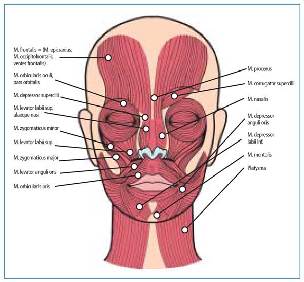 (Foto aus Chemische Denervation, Lernmodul Kapital 9: Faltentherapie aus Kapitel 9, Seite 5 mit Skizze Anatomie der Mimischen Muskeln und Fotos z.B. Glabellafalte= Zornesfalte Seite 9 Abb. 3, Nasenfältchen Seite 12 Abb. 15, Seite 13 Oberlippenfältchen, Seite 15 Abb. 17 Marionettenfalten)
